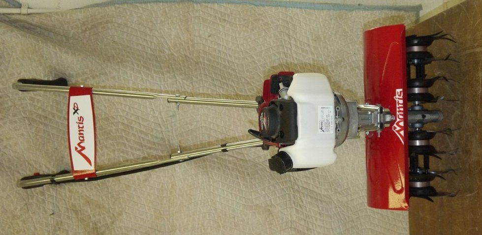 A red and black tractor is parked on a gravel road